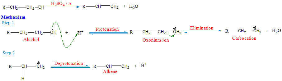 The correct answer is option 2. protonation of alcohol molecule During the dehydration of alcohols to form alkenes, the initiation step involves the protonation of the alcohol molecule by a strong acid such as concentrated sulfuric acid \((H_2SO_4)\). The sulfuric acid donates a proton \((H^+)\) to the oxygen atom of the alcohol, forming an oxonium ion or alkyl oxonium ion. Let us consider an example to understand the mechanism: