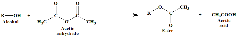 2. Using Acetic Anhydride: The acetic anhydride reacts with the alcohol to form an ester and acetic acid as a by-product. The reaction is: