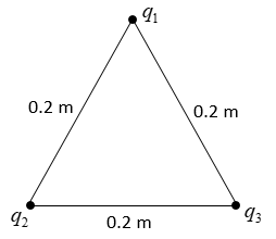 The correct answer is Option (3) → -27 J Given, $q$ = charge = $10 μC=10×10^{-6}C$ Now, $q_1=+q=10×10^{-6}C$ $q_2=-2q=-20×10^{-6}C$ $q_3=+4q=40×10^{-6}C$ Potential energy, $U=\frac{1}{4πε_0}\left(\frac{q_1q_2}{d}+\frac{q_2q_3}{d}+\frac{q_3q_1}{d}\right)$ $=\frac{1}{4πε_0}\left(\frac{10×10^{-6}×10×10^{-6}}{0.2}+\frac{-20×10^{-6}×40×10^{-6}}{0.2}+\frac{40×10^{-6}×10×10^{-6}}{0.2}\right)$ $=9×10^9[-10^{-6}-4×10^{-6}+2×10^{-6}]$ $=9×10^9×(-3×10^{-6})$ $=-27J$ |