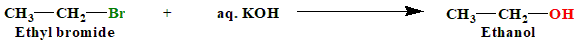 B. \(CH_3CH_2Br\, \ +\, \ aq. KOH\): IV. \(CH_3CH_2OH\) Reaction Type: Nucleophilic substitution (S\(_\text{N}\)2) When ethyl bromide reacts with aqueous KOH, a nucleophilic substitution reaction occurs. The hydroxide ion \((OH^-)\) from aqueous KOH replaces the bromine atom, resulting in the formation of ethanol \((CH_3CH_2OH)\).