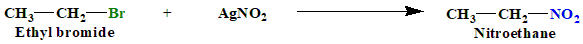 D. \(CH_3CH_2Br\, \ +\, \ AgNO_2\) : I. \(CH_3CH_2NO_2\) Reaction Type: Nucleophilic substitution (S\(_\text{N}\)2) When ethyl bromide reacts with silver nitrite \((AgNO_2)\), silver bromide precipitates out, and the nitrite ion \((NO_2^-)\) from silver nitrite acts as a nucleophile. This results in the formation of nitroethane \((CH_3CH_2NO_2)\).