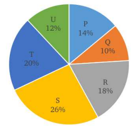 The following pie chart describes the sales of a particular brand of T-shirts in 6 of their outlets P, Q, R, S, T and U. The total sales in which two given outlets exceed the sales in the outlet S? |
