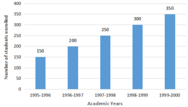 Study the graph and answer the question that follows. What is the ratio of enrollment during 1995 - 1996 to the enrollment during 1998 - 1999? |