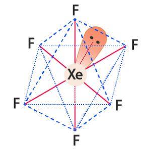 The correct answer is option 4. Distorted octahedral, \(sp^3d^3\). To determine the correct geometry and hybridization of \(XeF_6\), let us analyze the molecule step by step. Xenon (Xe) is in Group 18 of the periodic table, so it has 8 valence electrons. Fluorine (F) has 7 valence electrons, and there are 6 fluorine atoms in \(XeF_6\), contributing \(6 \times 7 = 42\) valence electrons. Total valence electrons = \(8 + 42 = 50\) electrons. In \(XeF_6\), xenon forms 6 bonds with fluorine atoms. Each bond uses 2 electrons, so \(6 \times 2 = 12\) electrons are used in bonding. The remaining electrons (\(50 - 12 = 38\) electrons or 19 pairs) must be placed around the xenon and fluorine atoms as lone pairs. Each fluorine atom needs 3 lone pairs to complete its octet (\(6 \times 3 = 18\) pairs or 36 electrons). After satisfying the octet of all fluorine atoms, 2 electrons (or 1 lone pair) are left on the xenon atom. Steric Number and Hybridization Steric number: The steric number is calculated as the sum of the number of atoms bonded to the central atom (6 fluorine atoms) plus the number of lone pairs on the central atom (1 lone pair). Steric number of \(Xe\) in \(XeF_6 = 6 + 1 = 7\). Hybridization: A steric number of 7 corresponds to the hybridization \(sp^3d^3\). For a steric number of 7, the ideal geometry is a pentagonal bipyramidal structure. Due to the presence of one lone pair, the molecule adopts a distorted octahedral geometry. The lone pair tends to occupy a position that causes the least repulsion, leading to distortion from the ideal structure. Geometry: Distorted octahedral Hybridization: \(sp^3d^3\) |