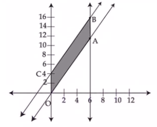 The correct answer is Option (1) → $y≥2x; y-2x≤4;x≤6;x, y ≥0$ $OA:y-2x=0$ $BC:=y-2x=4$ Since the 2 lines are parallel the feasible region is the bond between these lines. Therefore, the region lies between lines, described by: $0≤y-2x≤4$ $y-2x≥0⇒y≥2x$ $y-2x≤4$ $x≤6$ (As seen in graph) $x≥0$ (Non-negative constraints) $y≥0$ (Non-negative constraints) |