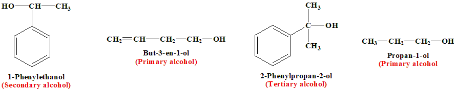 The correct answer is option 3. Primary, secondary, and tertiary alcohols are classified based on the carbon atom to which the hydroxyl group \(-OH\) is attached. Here’s a detailed explanation: Primary Alcohols (1° Alcohols) In primary alcohols, the carbon atom that carries the \(-OH\) group is attached to only one other alkyl group (or none if it's methanol) and two hydrogen atoms. General Formula: \(RCH_2OH\), where \(R\) is an alkyl group. Examples: Methanol \(CH_3OH\), Ethanol \(CH_3CH_2OH\), 1-Butanol \(CH_3CH_2CH_2CH_2OH\), etc.. Secondary Alcohols (2° Alcohols) In secondary alcohols, the carbon atom that carries the \(-OH\) group is attached to two other alkyl groups and one hydrogen atom. General Formula: \(R_2CHOH\), where \(R\) can be the same or different alkyl groups. Examples: Isopropanol \(CH_3CHOHCH_3\), 2-Butanol \(CH_3CH_2CHOHCH_3\), Cyclohexanol \(C_6H_{11}OH\) (the hydroxyl group is attached to a carbon in the cyclohexane ring), etc.. Tertiary Alcohols (3° Alcohols) In tertiary alcohols, the carbon atom that carries the \(-OH\) group is attached to three other alkyl groups and no hydrogen atoms. General Formula: \(R_3COH\), where \(R\) can be the same or different alkyl groups. Examples: tert-Butanol (2-Methyl-2-propanol) \(C(CH_3)_3OH\), 2-Methyl-2-butanol \(CH_3CH_2C(CH_3)_2OH\), 2-Methyl-2-pentanol \(CH_3CH_2CH_2C(CH_3)_2OH\), etc..