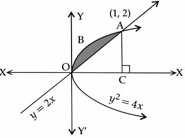 The correct answer is Option (1) → $\frac{1}{3}$ The area lying between the curve $y^2 = 4x$ and $y = 2x$ is represented by the shaded area $OBAO$ as shown in the figure. The points of intersection of the curves are $O(0, 0)$ and $A(1, 2)$. We draw $AC$ perpendicular to the $X$-axis such that the coordinate of $C$ is $(1, 0)$. $\text{Area of } OBAO = \text{Area of } OCABO - \text{Area of } \Delta OCA$ $A = \int_{0}^{1} 2\sqrt{x} \, dx - \int_{0}^{1} 2x \, dx$ $= 2 \left[ \frac{x^{3/2}}{3/2} \right]_{0}^{1} - 2 \left[ \frac{x^2}{2} \right]_{0}^{1}$ $= \left[ \frac{4}{3} - 1 \right]$ $= \left| \frac{1}{3} \right|$ $= \frac{1}{3} \text{ sq. units}$ |