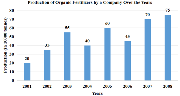 Lets find out one by one for each option . 1. 2002 Percentage increase in production in 2002 as compared to the previous year = \(\frac{35-20 }{20}\) × 100 = \(\frac{15 }{20}\) × 100 = 75% 2. 2005 Percentage increase in production in 2002 as compared to the previous year = \(\frac{60-40 }{40}\) × 100 = \(\frac{20 }{40}\) × 100 = 50% 3. 2007 Percentage increase in production in 2002 as compared to the previous year = \(\frac{70-45 }{45}\) × 100 = \(\frac{25 }{45}\) × 100 = 55.5% 4. 2008 Percentage increase in production in 2002 as compared to the previous year = \(\frac{75-70 }{70}\) × 100 = \(\frac{5 }{70}\) × 100 = 7.14% So , Percentage increase in production as compared to the previous year is maximum in year 2002. Ans :- 2002 |