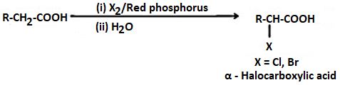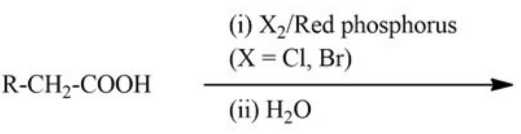 The correct answer is Option (1) → $α$-Halocarboxylic acid The given reaction uses halogen (Cl₂ or Br₂) in the presence of red phosphorus followed by hydrolysis with water. This set of reagents corresponds to the Hell–Volhard–Zelinsky (HVZ) reaction. The HVZ reaction is a well-known reaction in organic chemistry used for α-halogenation of carboxylic acids that contain at least one α-hydrogen. General reaction: R–CH₂–COOH → R–CHX–COOH (X = Cl or Br) Steps involved: 1. Formation of acyl halide Red phosphorus reacts with halogen to form PX₃, which converts the carboxylic acid into an acid halide (R–CH₂–COX). 2. α-Halogenation The acid halide undergoes enol formation, and the halogen substitutes the α-hydrogen to produce R–CHX–COX. 3. Hydrolysis When treated with water, the acid halide converts back into the carboxylic acid, giving α-halocarboxylic acid. Final product: R–CHX–COOH Thus, halogen substitution occurs specifically at the α-carbon (carbon adjacent to the carboxyl group). Option-wise Explanation Option 1: α-Halocarboxylic acid In the HVZ reaction, halogen substitution occurs at the α-position of the carboxylic acid due to enol formation and electrophilic halogenation. After hydrolysis, the product becomes R–CHX–COOH, which is an α-halocarboxylic acid. Therefore, this option is correct. Option 2: β-Halocarboxylic acid β-Halogenation would involve substitution at the second carbon away from the carboxyl group. The HVZ reaction specifically halogenates the α-carbon, not the β-carbon. Hence this option is incorrect. Option 3: α, β-Dihalocarboxylic acid The reaction introduces only one halogen atom at the α-position. It does not produce halogen substitution at both α and β positions. Therefore this option is incorrect. Option 4: 1,1-Dihalocarboxylic acid This structure would require two halogens attached to the same carbon atom. The HVZ reaction introduces only one halogen atom at the α-carbon, so this option is incorrect. |