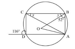 ∠CDA = 180° - 116° = 64° ABCD is a cyclic quadrilateral, So, ∠CDA + ∠CBA = 180° ∠CBA = 180° - 64° ∠CBA = 116° Now, ∠OBC + ∠OBA = 116° 52° + ∠OBA = 116° ∠OBA = 116° - 52° = 64° The correct answer is option (2) : 64° |