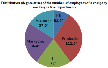 Difference in total number of employees of the company working in production and IT department to the working in the Marketing and Accounts departments = ( 111.6º + 72º ) - ( 86.4º + 57.6º ) = 183.6º - 144º = 39.6º ⇒ \(\frac{39.6º}{360º}\) × 1400 = 154 |