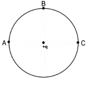 Point A, B and C are at the same distance from charge +q; hence electrical potential is the same at these points, i.e. There is no potential difference between A, B and C. Hence W1 = W2 = 0. |
