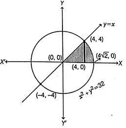 The correct answer is Option (2) → $4\pi$ sq units We have, area enclosed by X-axis i.e., $y = 0$, $y = x$ and the circle $x^2 + y^2 = 32$ in first quadrant. Since, $x^2 + (x)^2 = 32$ $[∵y = x]$ $\Rightarrow 2x^2 = 32$ $\Rightarrow x = \pm 4$ So, the intersection point of circle $x^2 + y^2 = 32$ and line $y = x$ are $(4, 4)$ or $(-4, -4)$. And $x^2 + y^2 = (4\sqrt{2})^2$ Since, $y = 0$ $∴$ $x^2 + (0)^2 = 32$ $\Rightarrow$ $x = \pm 4\sqrt{2}$ So, the circle intersects the X-axis at $(\pm 4\sqrt{2}, 0)$. As we have to find the area of the region in first quadrant we will take only positive value of $x$ and $y$. $\text{Area of shaded region} = \int_{0}^{4} x dx + \int_{4}^{4\sqrt{2}} \sqrt{(4\sqrt{2})^2 - x^2} dx$ $= \left[ \frac{x^2}{2} \right]_{0}^{4} + \left[ \frac{x}{2} \sqrt{(4\sqrt{2})^2 - x^2} + \frac{(4\sqrt{2})^2}{2} \sin^{-1} \frac{x}{4\sqrt{2}} \right]_{4}^{4\sqrt{2}}$ $= \frac{16}{2} + \left[ \frac{4\sqrt{2}}{2} \cdot 0 + 16 \sin^{-1} \frac{(4\sqrt{2})}{(4\sqrt{2})} - \frac{4}{2} \sqrt{(4\sqrt{2})^2 - 16} - 16 \sin^{-1} \frac{4}{4\sqrt{2}} \right]$ $= 8 + \left[ 16 \cdot \frac{\pi}{2} - 2 \cdot \sqrt{16} - 16 \cdot \frac{\pi}{4} \right]$ $= 8 + [8\pi - 8 - 4\pi] = 4\pi \text{ sq. units}$ |