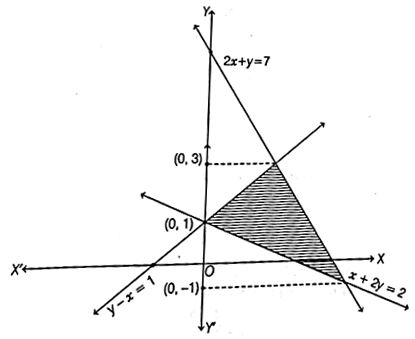 The correct answer is Option (2) → $6$ square units We have, $x + 2y = 2 \quad \dots(i)$ $y - x = 1 \quad \dots(ii)$ and $2x + y = 7 \quad \dots(iii)$ On solving Eqs. (i) and (ii), we get $y - (2 - 2y) = 1 \Rightarrow 3y - 2 = 1 \Rightarrow y = 1$ On solving Eqs. (ii) and (iii), we get $2(y - 1) + y = 7$ $\Rightarrow 2y - 2 + y = 7 \Rightarrow y = 3$ On solving Eqs. (i) and (iii), we get $2(2 - 2y) + y = 7$ $\Rightarrow 4 - 4y + y = 7 \Rightarrow -3y = 3 \Rightarrow y = -1$ $∴$ Required area $= -\int\limits_{-1}^{1} (2 - 2y) \, dy + \int\limits_{-1}^{3} \frac{(7 - y)}{2} \, dy - \int\limits_{1}^{3} (y - 1) \, dy$ $= -\left[ 2y - \frac{2y^2}{2} \right]_{-1}^{1} + \left[ \frac{7y}{2} - \frac{y^2}{2 \cdot 2} \right]_{-1}^{3} - \left[ \frac{y^2}{2} - y \right]_{1}^{3}$ $= -\left[ 2 - 1 - (-2 - 1) \right] + \left[ \left( \frac{21}{2} - \frac{9}{4} \right) - \left( -\frac{7}{2} - \frac{1}{4} \right) \right] - \left[ \left( \frac{9}{2} - 3 \right) - \left( \frac{1}{2} - 1 \right) \right]$ $= -[4] + \left[ \frac{42 - 9 + 14 + 1}{4} \right] - \left[ \frac{9 - 6 - 1 + 2}{2} \right]$ $= -4 + 12 - 2 = 6 \text{ sq. units}$ |