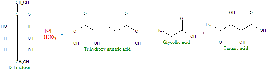 The correct answer is option 4. all of the above. On oxidation with nitric acid, fructose gives a mixture of acids, namely trihydroxyglutaric acid, tartaric acid, and glycollic acid.