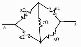A bridge circuit is shown in the diagram. The equivalent resistance between A and B is