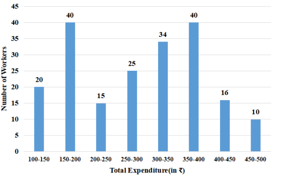 Number of workers with total expenditure is ₹350 and above = 40 + 16 + 10 =66 Number of workers whose total expenditure is less than ₹250 = 20 + 40 + 15 = 75 Required percentage = \(\frac{75-66 }{75}\) × 100 = \(\frac{9 }{3}\) × 4 = 12% |