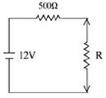 The correct answer is Option (4) → 100Ω $R_{effective}=500+R$ [Connected in series] $V=12V$ $500×\frac{12}{500+R}+R×\frac{12}{500+R}=12$ $⇒R=100Ω$ |