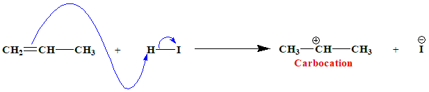 Addition of HI on double bond of propene yields isopropyl iodide and not n-propyl iodide as the major product, because addition proceeds through |