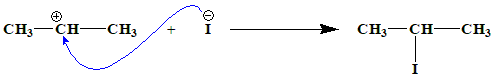 Stability of the carbocation: The secondary carbocation is more stable than a primary carbocation due to hyperconjugation and inductive effects. The iodide ion (\(I^-\)) then attaches to the positively charged carbon, resulting in the formation of isopropyl iodide. |