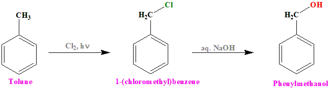 The correct answer is option 4. Benzylalcohol. Halogenation in the presence of light follows free radical pathway and thus will react with the alkyl group to give halo alkyl. Thus formed haloalkyl in the presence of alkaline medium will undergo substitution reaction and will form an alcohol by replacing halogen atom in haloalkyl group. The reaction with toluene can be represented as:
