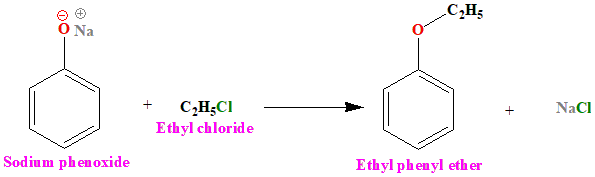 The correct answer is option 2. \(C_6H_5OC_2H_5\). The reaction between sodium phenoxide and ethyl chloride is a well-known example of Williamson’s reaction which involves a substitution bimolecular mechanism to produce the corresponding ethers. The alkyl group attached to the halogen breaks apart and forms a bond with the oxygen of the phenoxide group to give ethyl phenyl ether. The remaining sodium ions and chloride ions react with each other to form sodium chloride as a byproduct. The reaction can be initiated by forming phenoxide ions from phenol that can be used to react with alkyl halides. Since, the mechanism is \(S_N2\) in nature, the alkyl halide needs to be a primary alkyl halide as the reactivity decreases with increasing substitutions. A secondary or tertiary alkyl halide fails to produce an ether by substitution mechanism and elimination is preferred over a substitution reaction. Both protic or aprotic solvents can be used for this type of ether synthesis. The reaction can be written as follows: